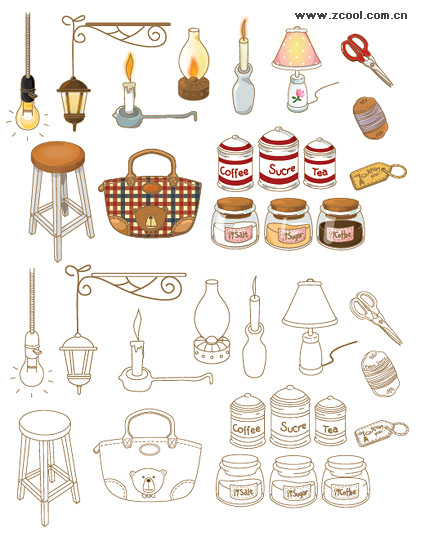 eps format, including jpg preview, keyword: Vector icons, candles, oil lamps, bulbs, scissors, table, chair, bag, bottle, key chain, sewing, glass bottles, hand-painted icons, vector material