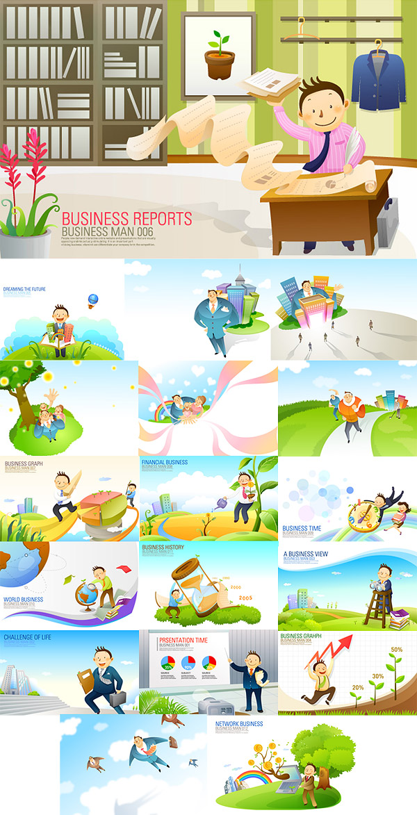 ai formats, including jpg preview, keyword: Vector business, business, cartoons, work, white-collar workers, statistics, data, rainbow, trees, round cakes, a house, work, plant, vector material